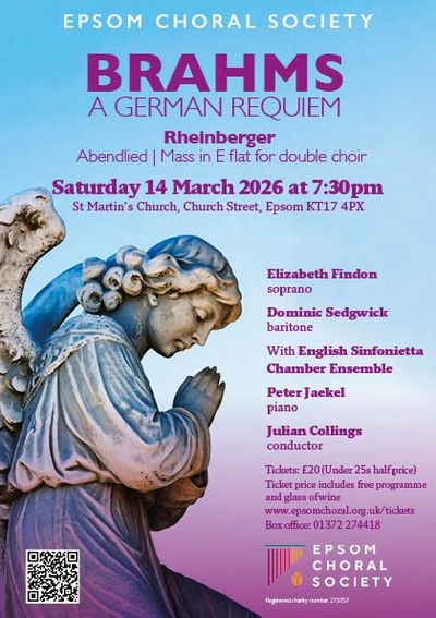 Our next concert will be the beautiful Brahms German Requiem on Saturday 14th March 2026 at St Martin's Church, Epsom in a version for chamber ensemble. We will be singing it with two works by Rheinberger - Abendlied and Mass in E flat for double choir